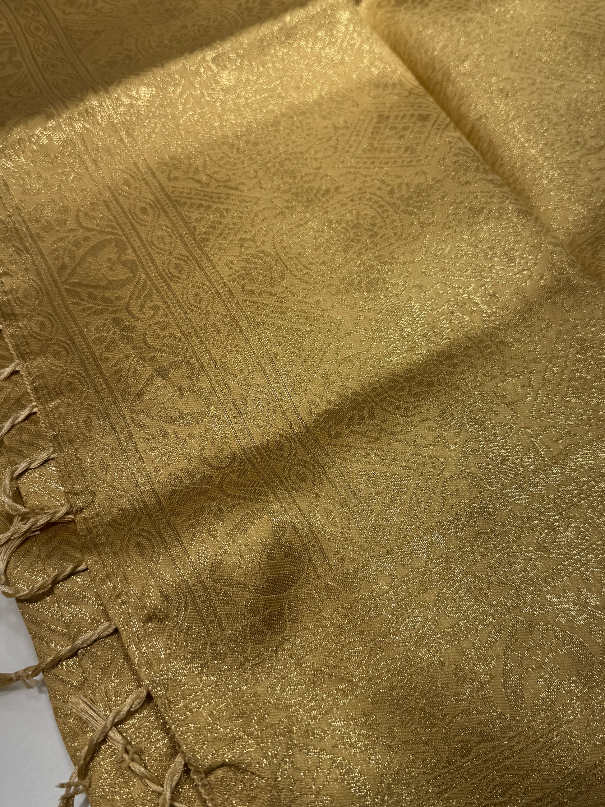 Material: Semi Soft Silk with attached blouse, highlighted with rich golden zari motifs