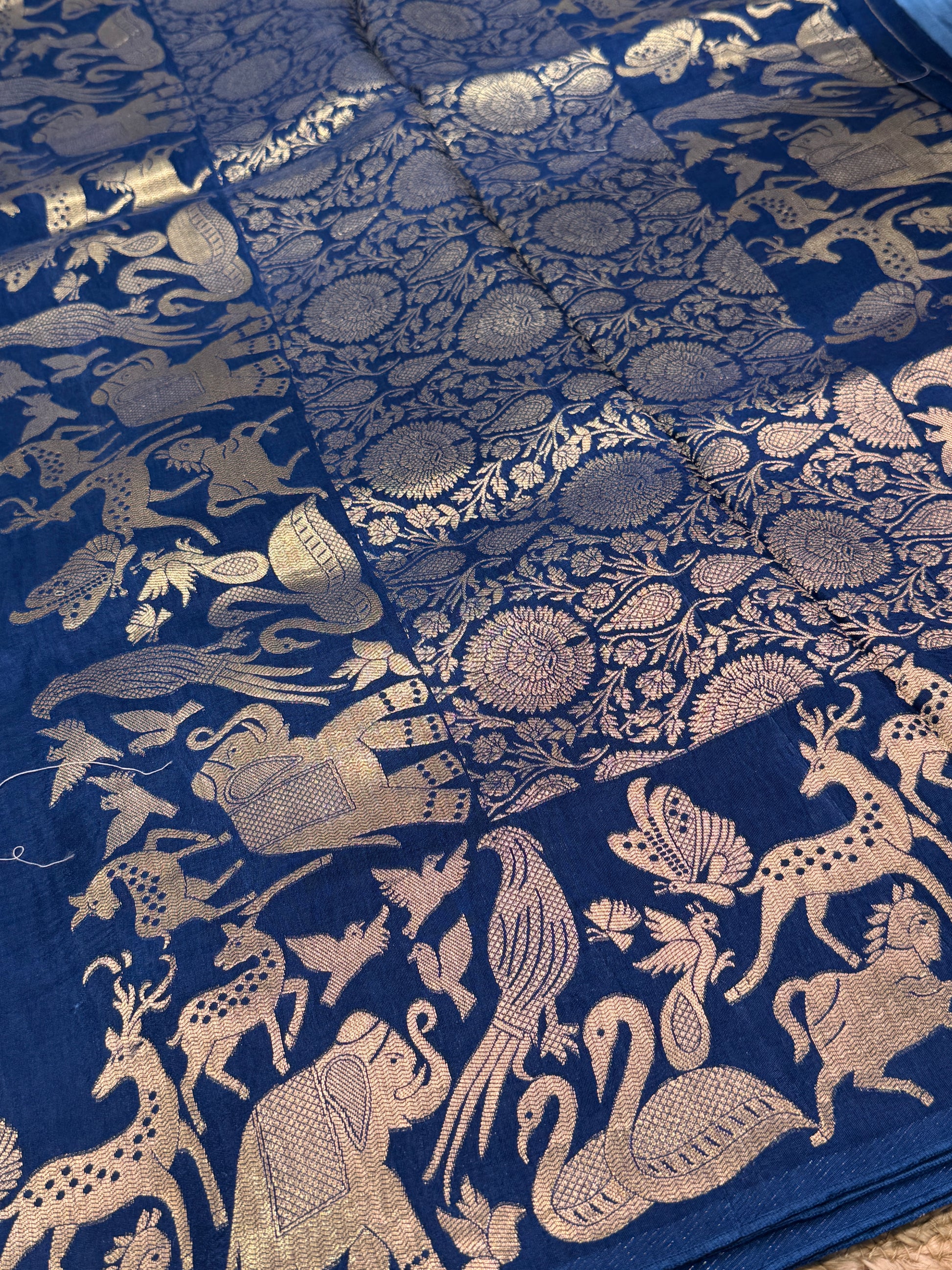 Material: Premium Russian Silk adorned with Anti-Golden Jungle Theme Zari motifs, comes with an attached blouse